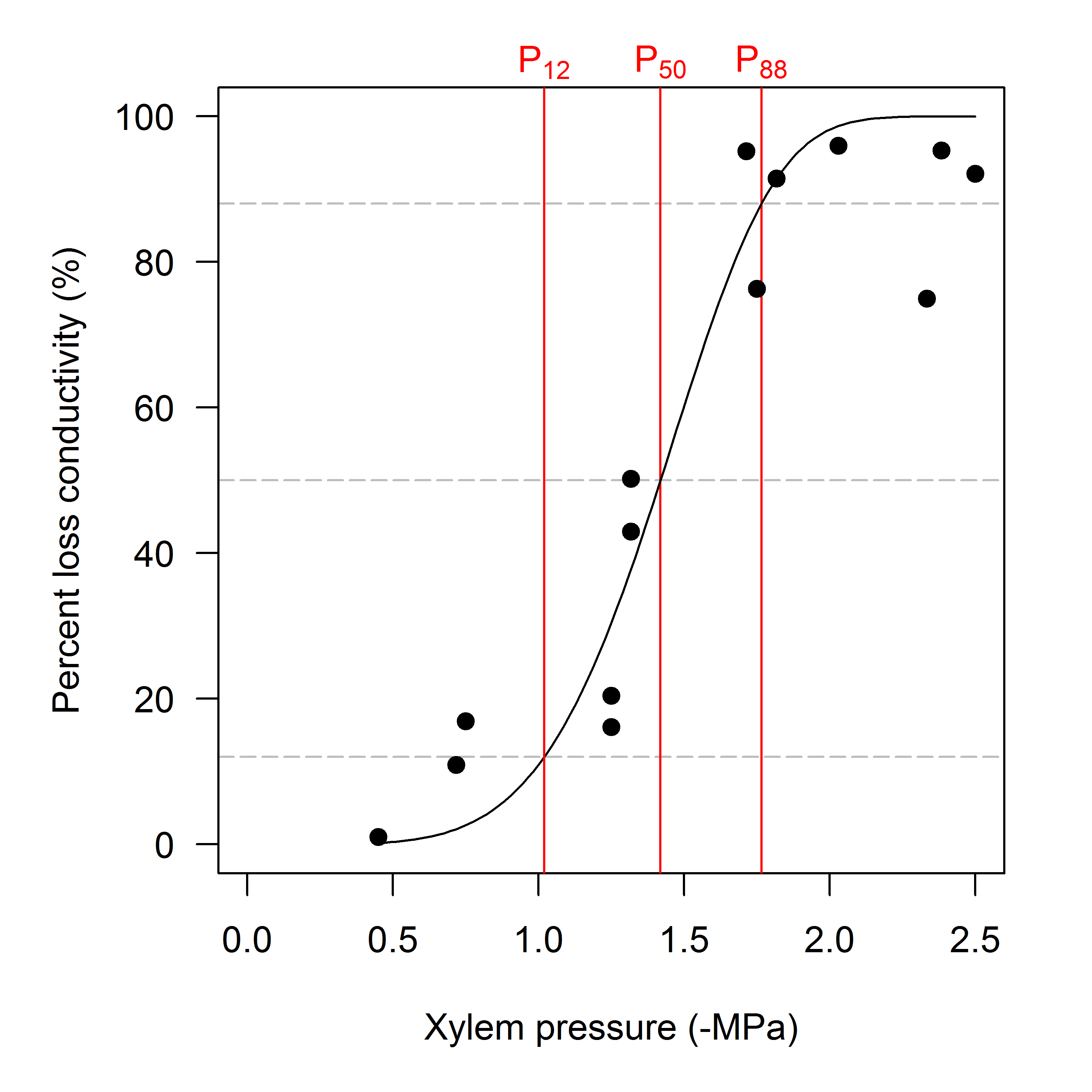 The first example shows how we can estimate P12, P50 and P88 from a hydraulic vulnerability curve, and make a simple plot of the fitted curve and the raw data (Fig. 1). Note how the result from fitplc is stored in an object that can be readily plotted. In this case we decide to plot % embolism ('percent loss conductivity', PLC) as a function of xylem pressure (what = "PLC" - a synonym is what = "embol"); the default is to plot relative conductivity as a function of xylem pressure (see later figures). By default, the Weibull model is fit to the data, unless the argument model = "sigmoidal" is specified.