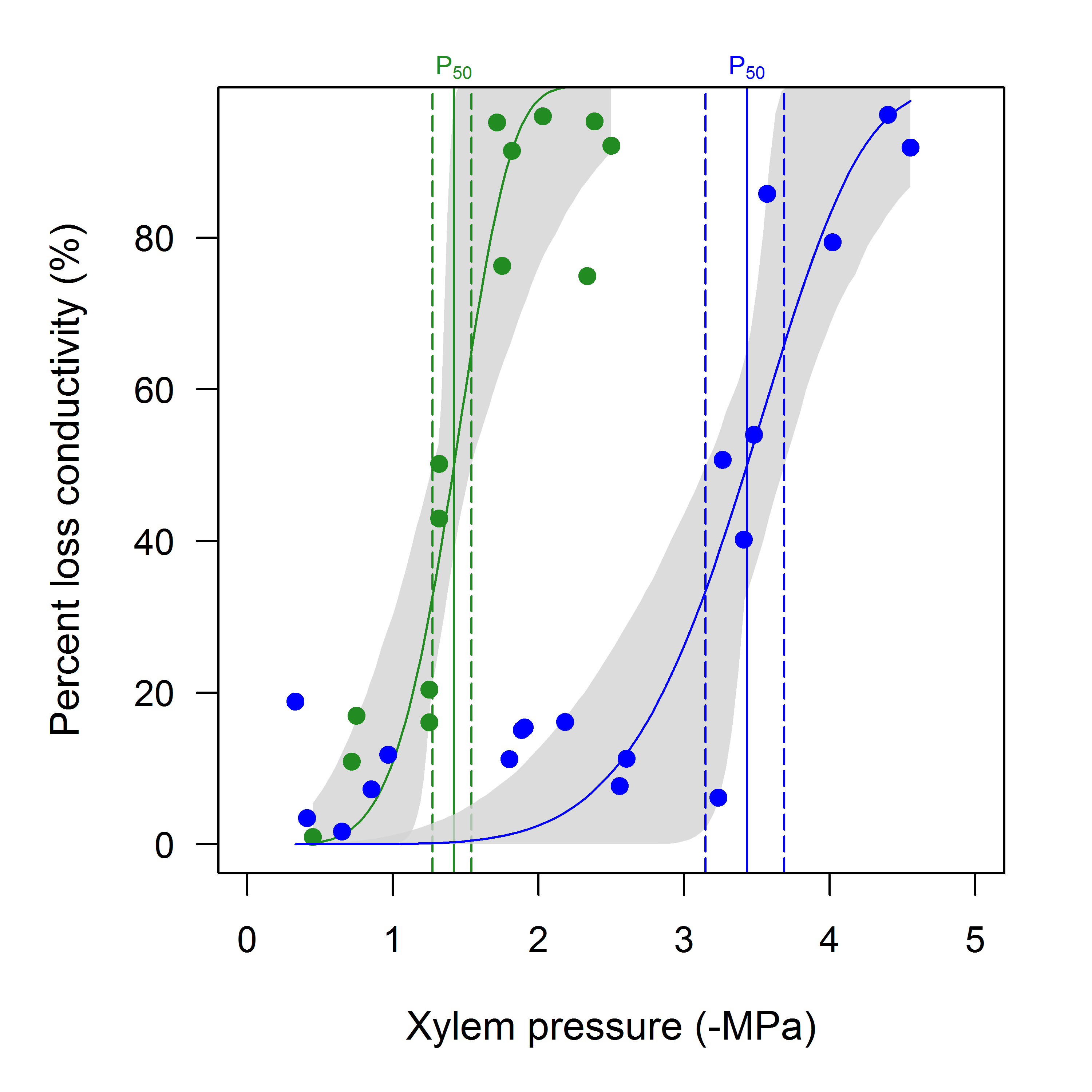 Blue symbols and line : Prunus turneriana, green symbols and line : Cochlospermum gillivraei. Vertical dashed lines indicate the 95% confidence interval for P50 (estimated from the bootstrap in this example, though standard confidence intervals from non-linear regression can also be used). Note how the confidence intervals are not symmetric. The grey shaded area is the 95% bootstrapped confidence interval for the fitted curve.