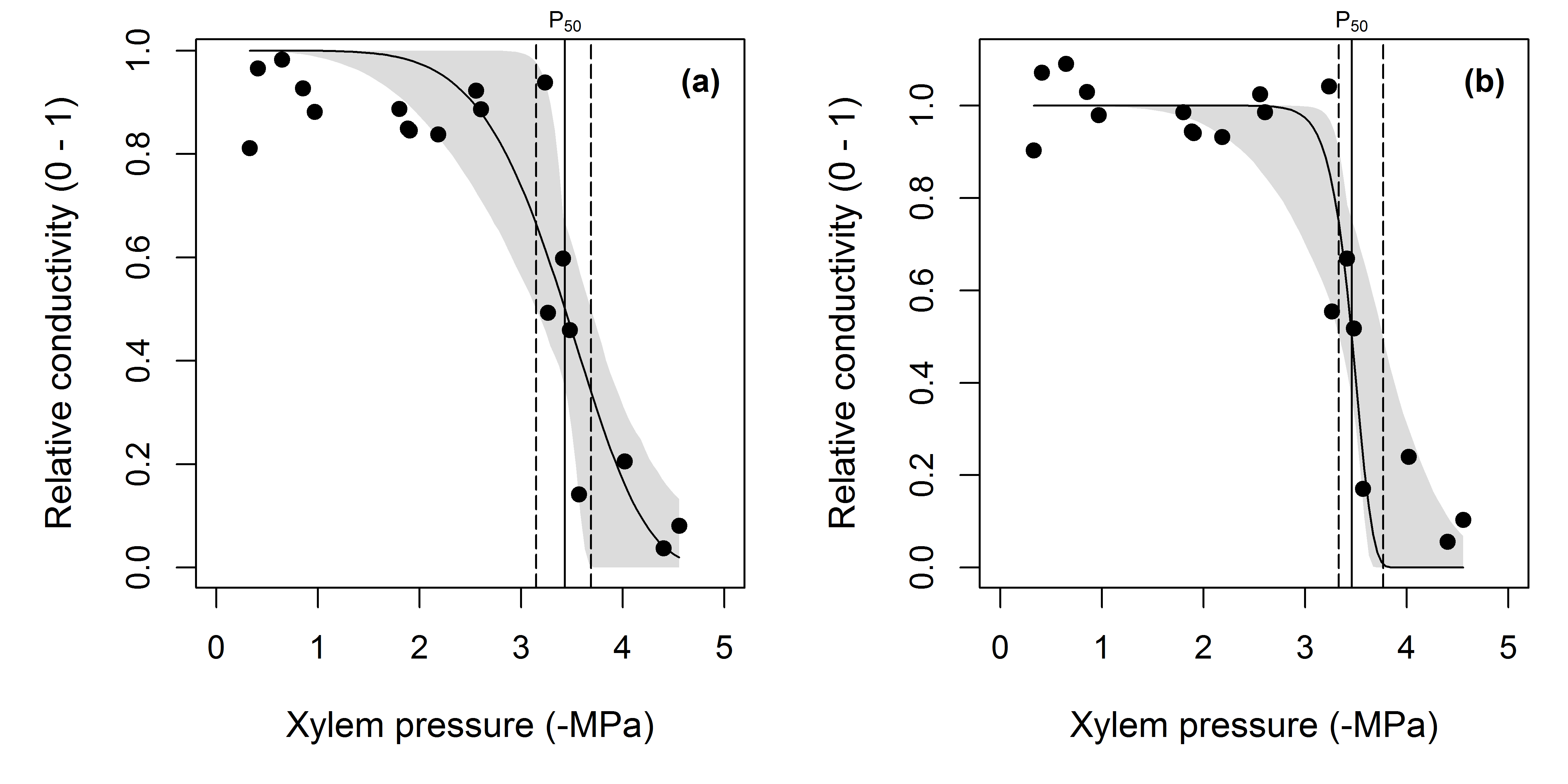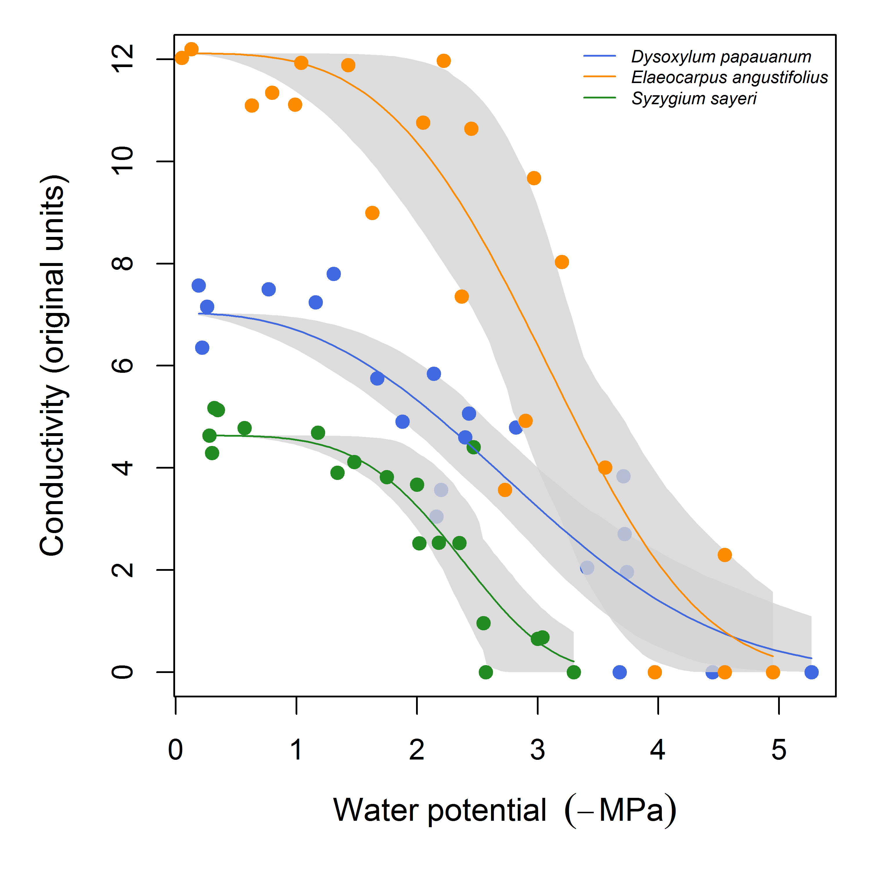 In this example, the maximum conductivity was calculated from the data where water potential > -0.3 MPa. The grey areas are bootstrap confidence intervals for the fit. Estimates of P50 are omitted for clarity.