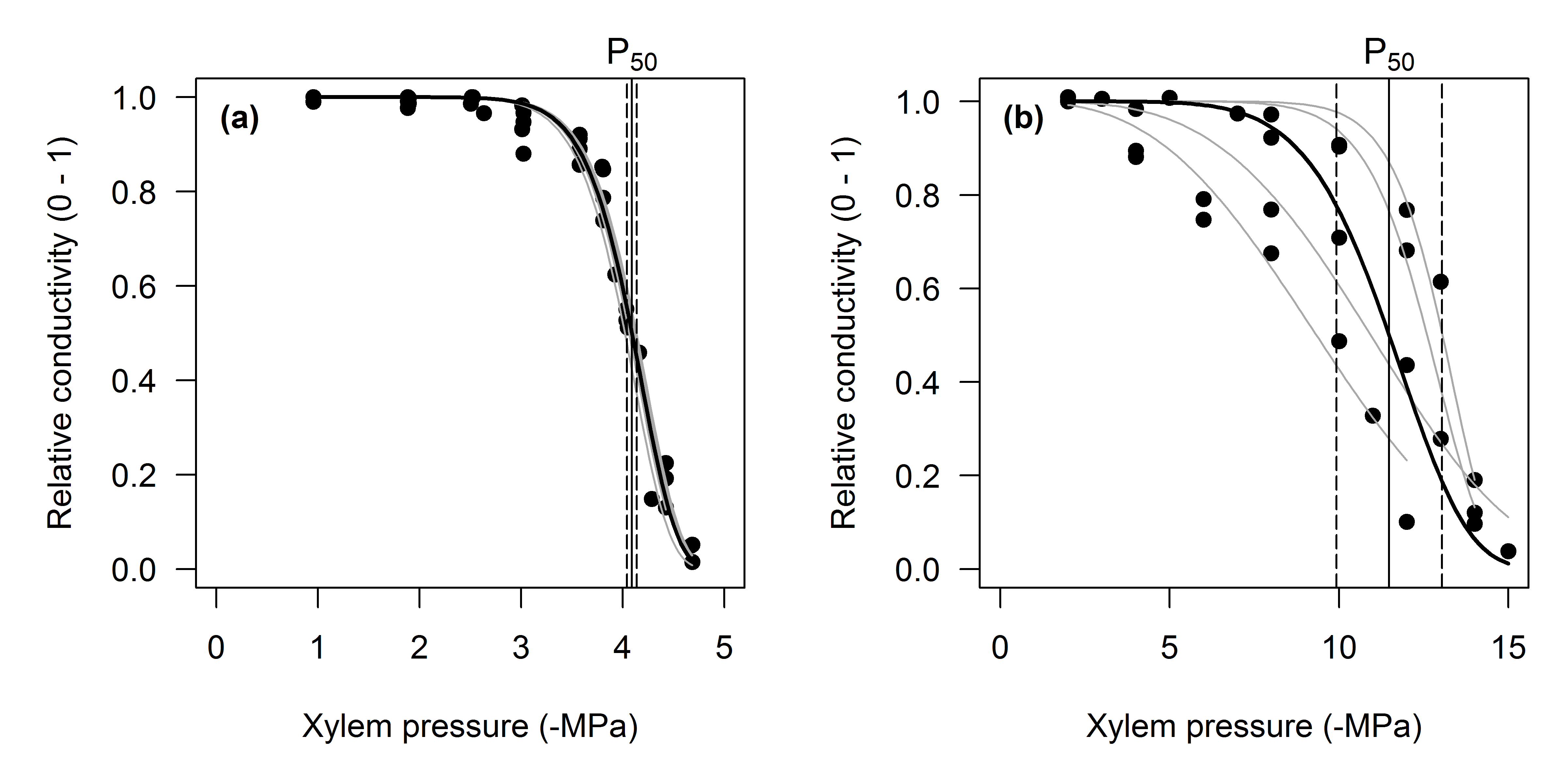 The example is shown in Fig. 2, where two species with very different vulnerability are compared in terms of their P50 and fitted curve. In this case, PLC at any xylem pressure is different between the species, as indicated by the non-overlapping 95% confidence intervals. Clearly, the P50's are also very different. Plots such as these are easy to construct with the default plotting routine, and refer to the online repository for the complete code to the examples.