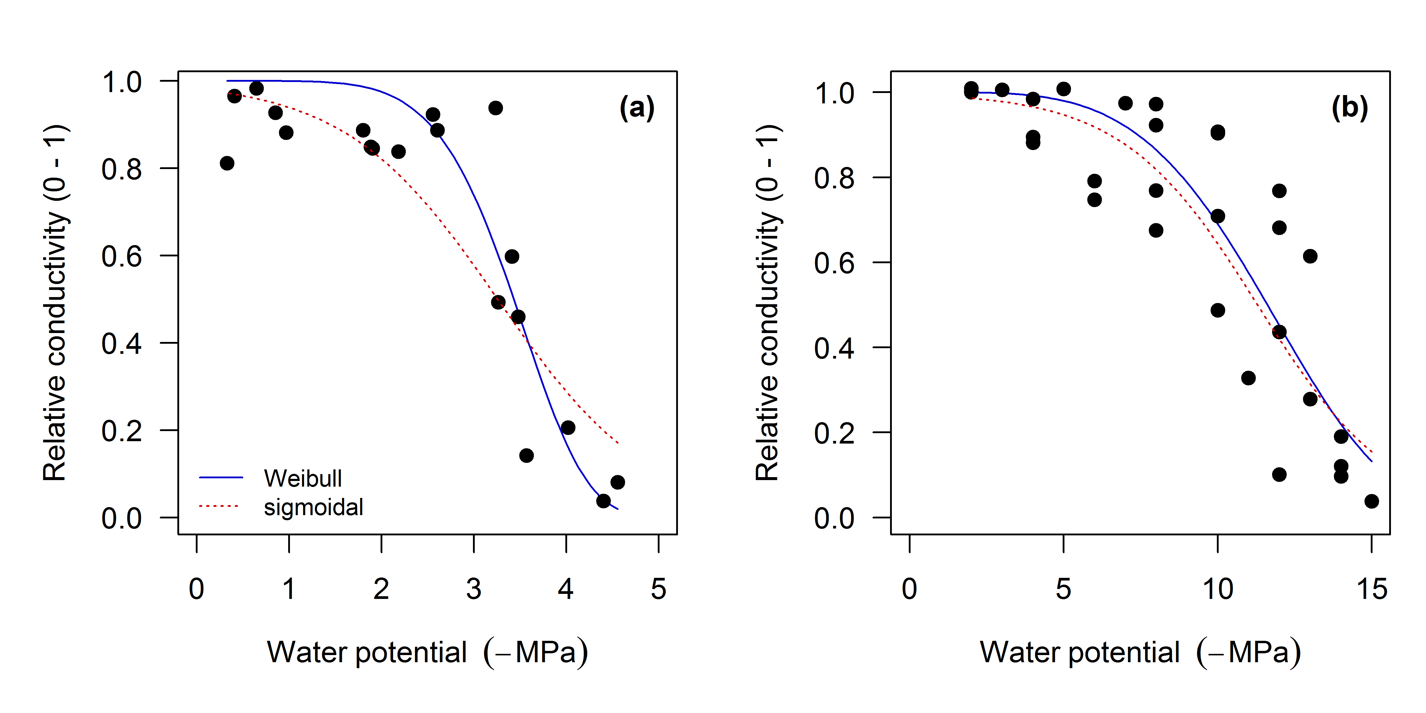 A comprehensive comparison of the Weibull and sigmoidal models is well outside the scope of this paper. However, we found a few problems with the sigmoidal model, in particular the log-transformed version as presented by Pammenter and Van der Willigen (1998). The first problem, as reported by Ogle et al. (2009), is that the sigmoidal model does not guarantee that PLC is zero at P = 0; the PLC is often higher and depends on the overall response of PLC to P. In contrast, in the Weibull model, PLC = 0 at P = 0, which is more biologically reasonable. The second problem we found is that curves with a very steep response of PLC to P are poorly fit by the sigmoidal model (see Fig. 6a), but for other curves the fits are very comparable (Fig. 6b). Finally, the log-transformed version (Eq. 4) is very sensitive to very low values of conductivity, because values close to zero are large negative values when log-transformed, and may have a large impact on estimated coefficients (as we found with one example dataset; not shown). For these reasons we recommend the Weibull model as the default choice, but encourage more comprehensive comparisons.